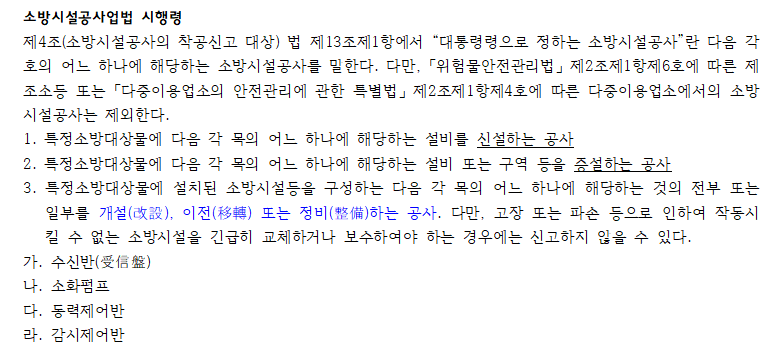 가. 소방시설공사업법 시행령 제4조(소방시설공사의 착공신고 대상)